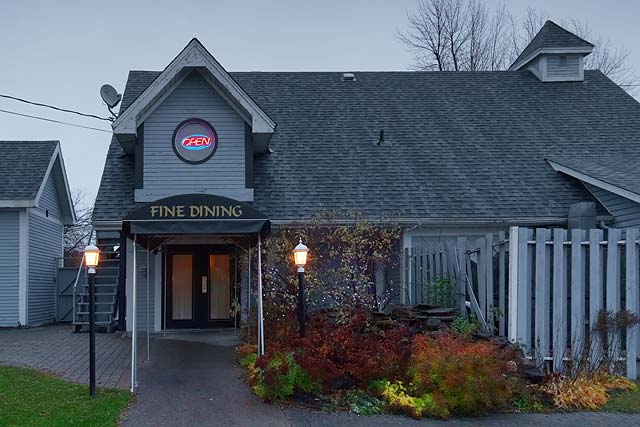 Rather than Hawaii, we instead dined at The Shipwreck restaurant in Rideau Ferry, a small community 10 miles (16 km) southwest of here along the Rideau Canal Waterway and straddles the narrow stretch of water joining Big Rideau Lake with Lower Rideau Lake. The restaurant is on the banks of the waterway, just off the western end of the bridge that crosses it, so on a pretty day it would offer a fabulous view. Sadly, today was not pretty, but overcast, cold, and drizzly with even a few flakes of snow in the air by the time we left just after dark.